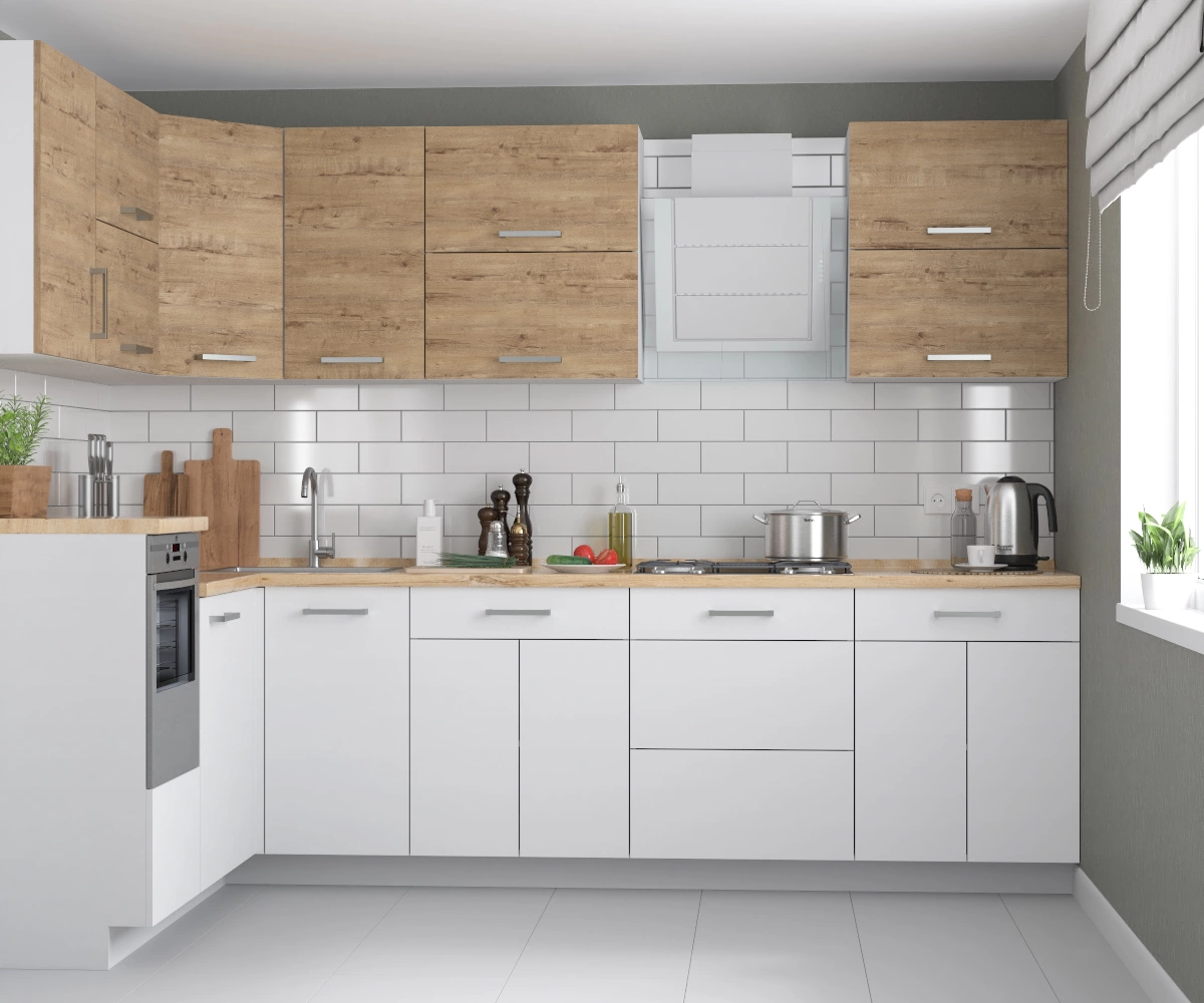 Прекрасная кухня «Эбони» собственного производства “Балтика Мебель” изготовлена в популярных цветовых вариантах и материалах фасадов. Высокие антресоли увеличат место для хранения, а уборка станет проще, не будет того самого неудобного зазора между верхними шкафами и потолком, где годами скапливается пыль и куда трудно достать при уборке. Нижние модули открываются одним легким нажатием при помощи качественной фурнитуры TIP-ON.