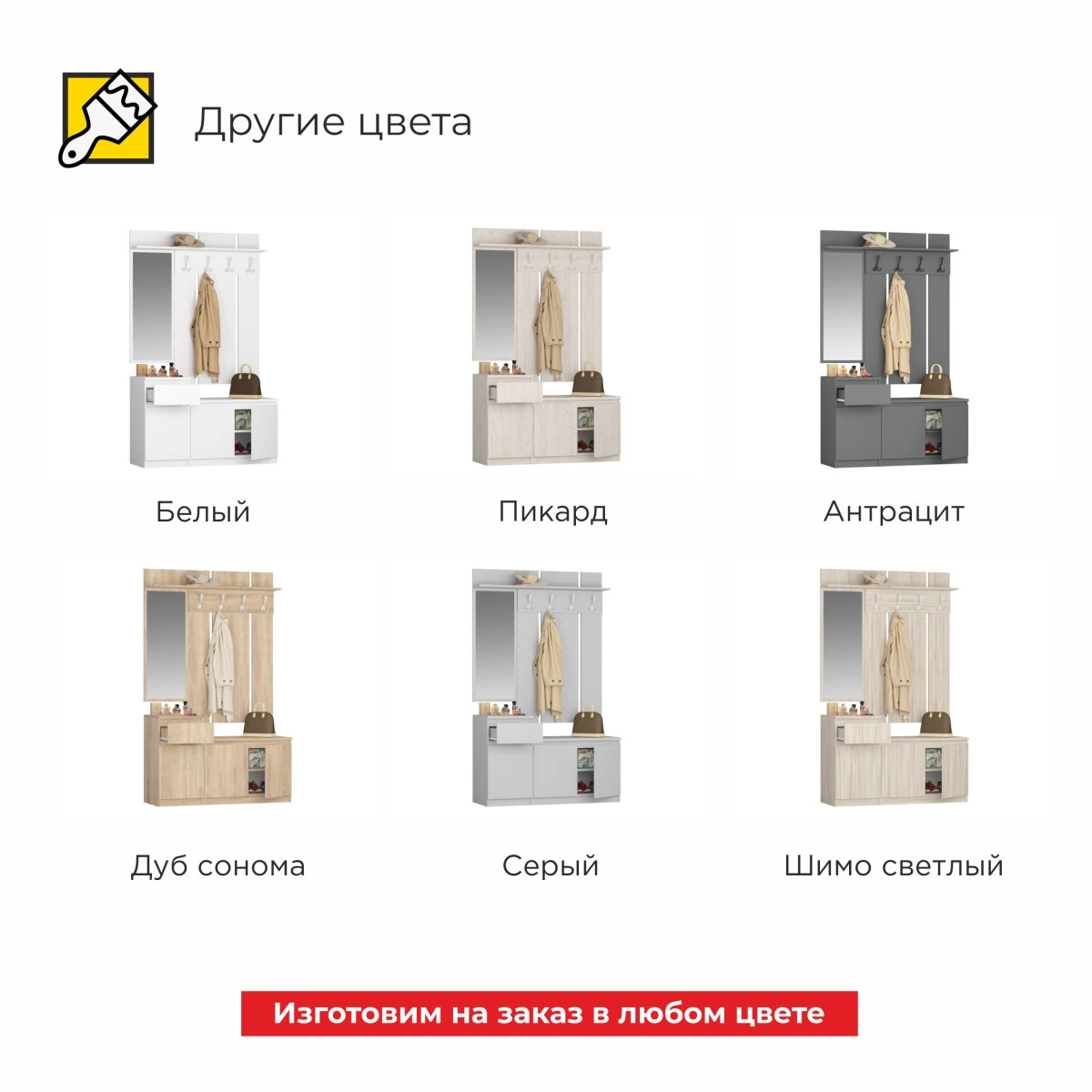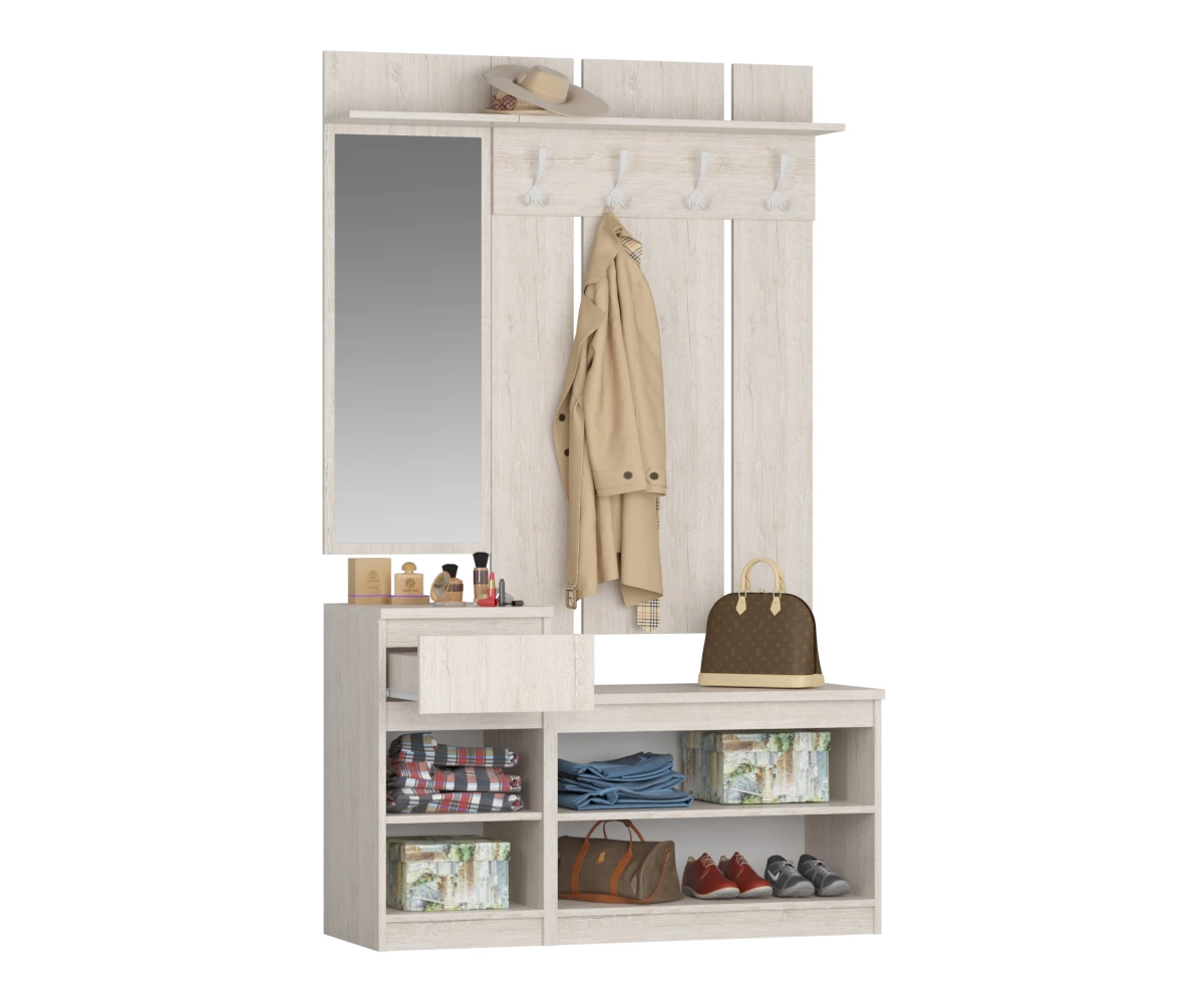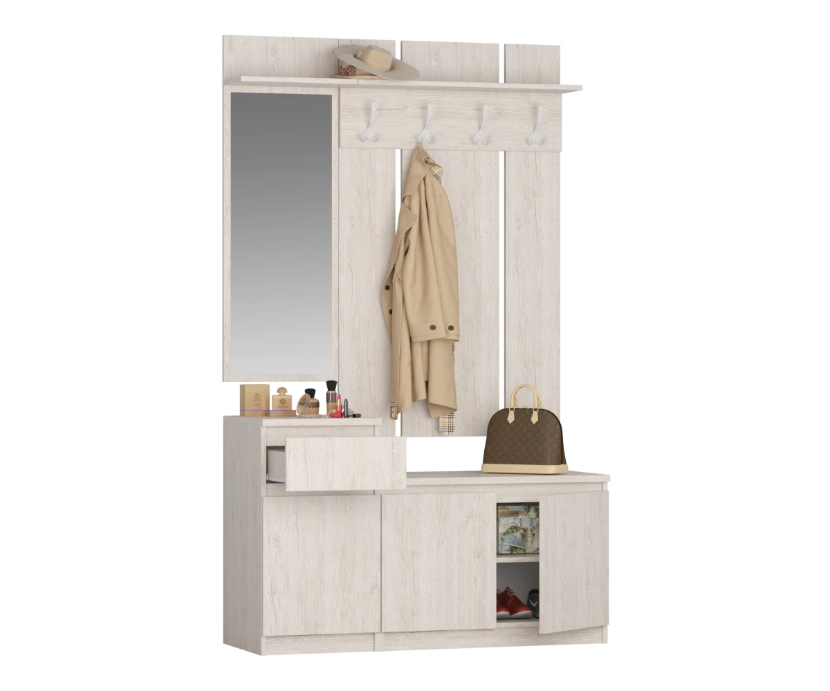 Комплект включает в себя разнообразные элементы, которые позволяют с легкостью организовать пространство в прихожей. Удобные вешалки обеспечивают место для верхней одежды и аксессуаров, а практичные полки и ящики позволяют аккуратно разместить обувь и другие предметы. Стильный дизайн и современная отделка делают этот комплект привлекательным акцентом в любом интерьере.