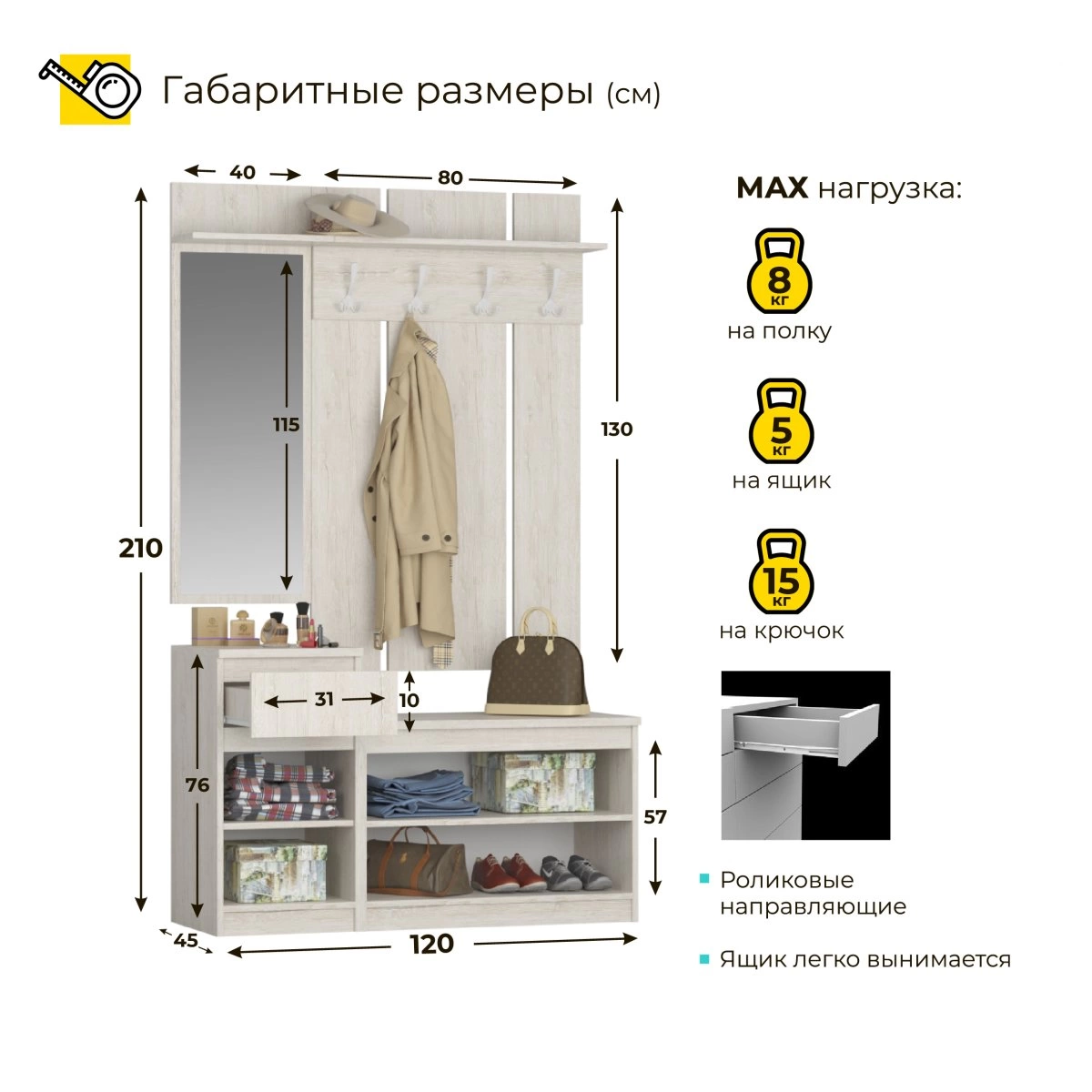 Мебель изготовлена из качественных материалов, что гарантирует высокую прочность и долговечность. Компактные размеры делают его идеальным для даже самых небольших прихожих, а разнообразие цветовых решений позволит выбрать именно тот вариант, который гармонично впишется в ваше пространство.