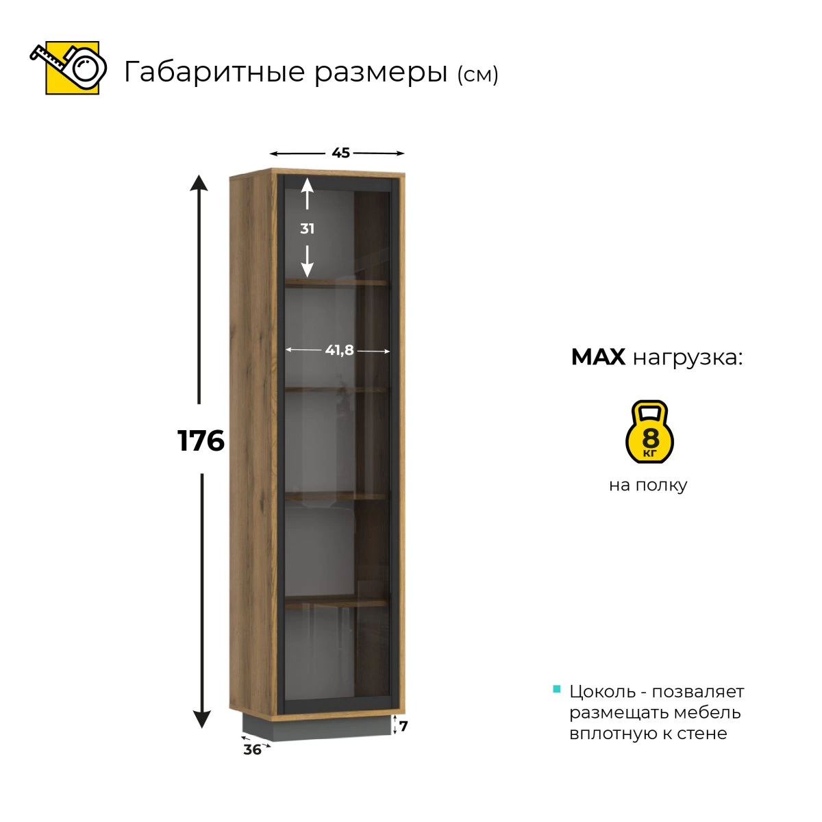 Шкаф-пенал Лофт обладает достаточной вместительностью для хранения большого количества книг, документов или декоративных предметов. Удобные полки различной высоты позволяют оптимально распределить все необходимые вещи, а если нужно, легко достать их в любой момент. Это делает пенал не только стильным, но и очень функциональным элементом мебели.