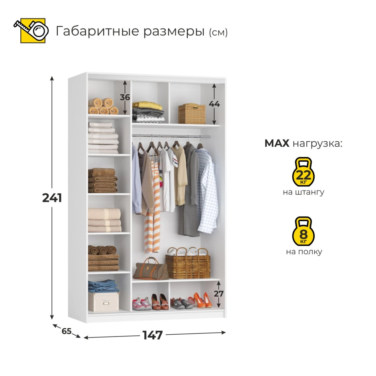 Эта модель выполнена из качественных материалов, что гарантирует долговечность и надежность. Шкаф-купе предлагает достаточно места для хранения одежды, обуви и других личных вещей, благодаря продуманной внутренней компоновке с полками и штангами для вешалки. Удобные размеры и продуманная конструкция делают его подходящим как для небольших, так и для просторных помещений.