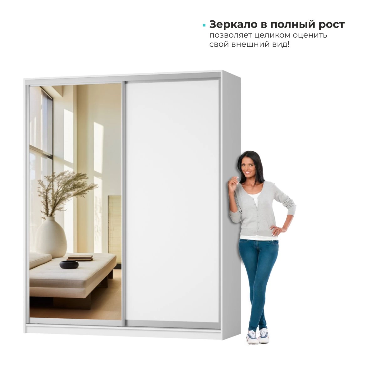 Конструкция изделия обеспечивает надежность и долговечность. Шкаф-купе легко открывается и закрывается, что делает его использование комфортным. Кроме того, слежение за чистотой и уход за мебелью не требует много усилий, что является важным преимуществом в современном ритме жизни.