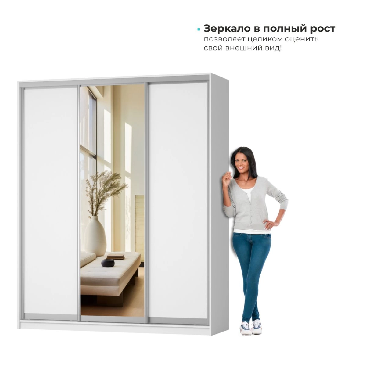 Основная особенность этой модели – большое зеркало, которое не только визуально увеличивает пространство, но и позволяет с удобством оценить свой внешний вид. Шкаф-купе подходит для спальни, гостиной или прихожей, становясь универсальным решением для хранения вещей.