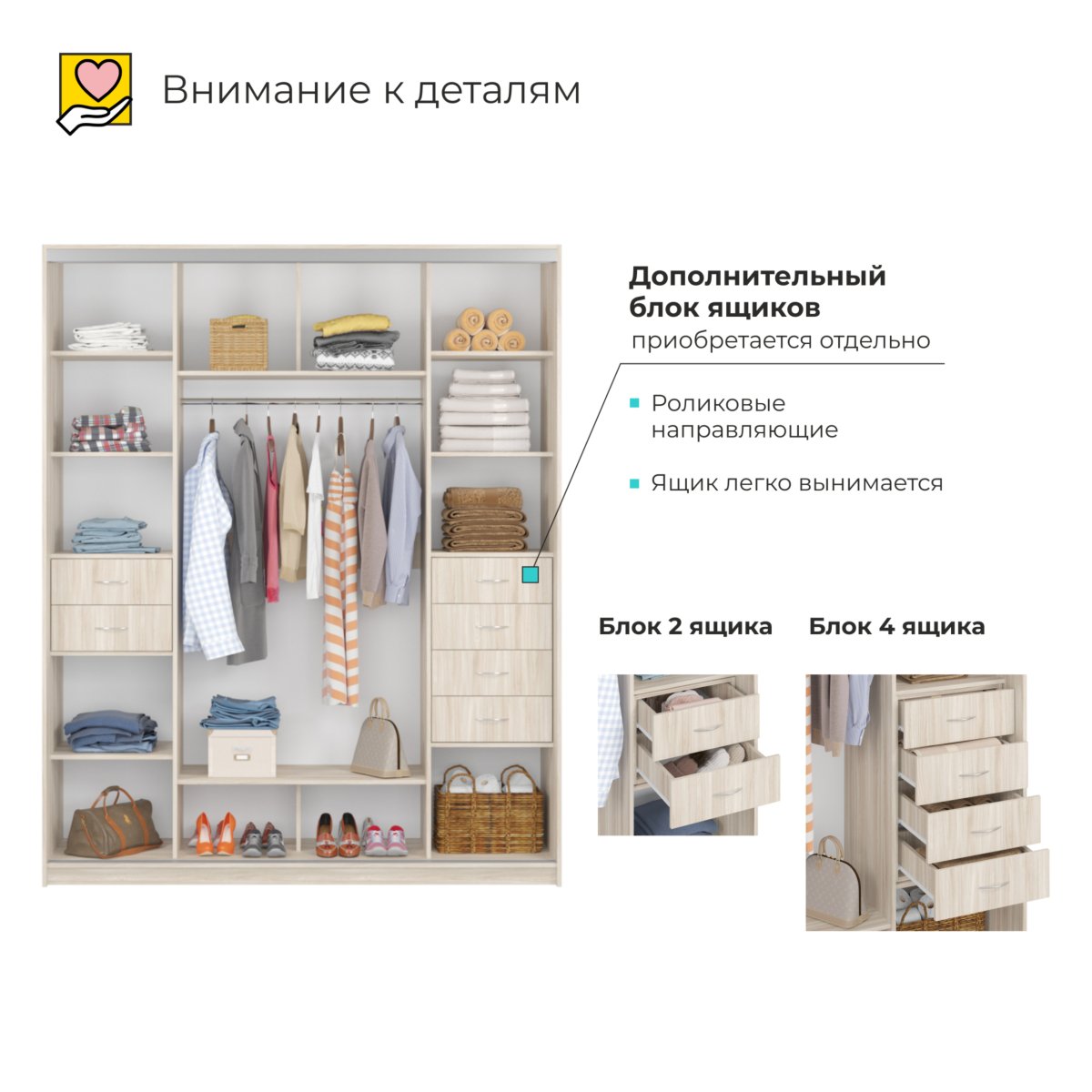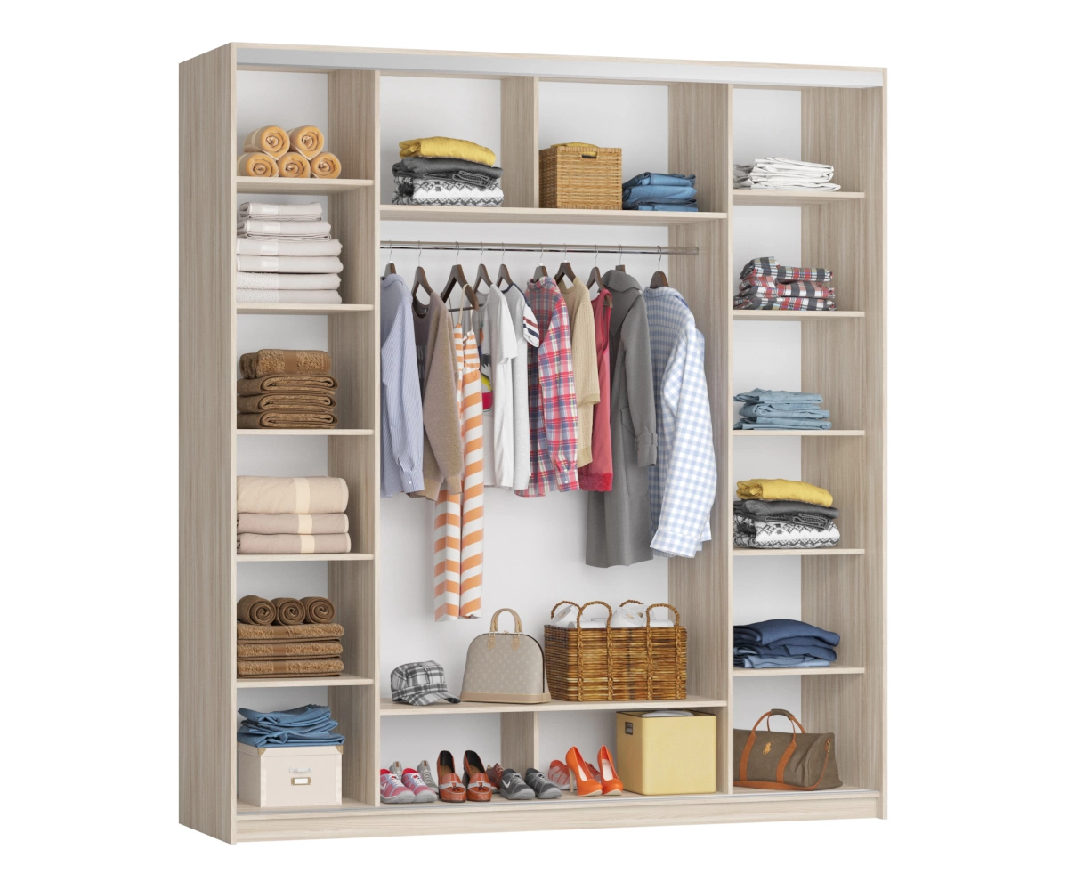 Внутреннее пространство шкафа достаточно вместительное и продуманное. Вам не придется беспокоиться об организованности ваших вещей, ведь наличие полок и вешалок позволяет разделить одежду по категориям. Это существенно упрощает процесс выбора наряда и помогает поддерживать порядок.