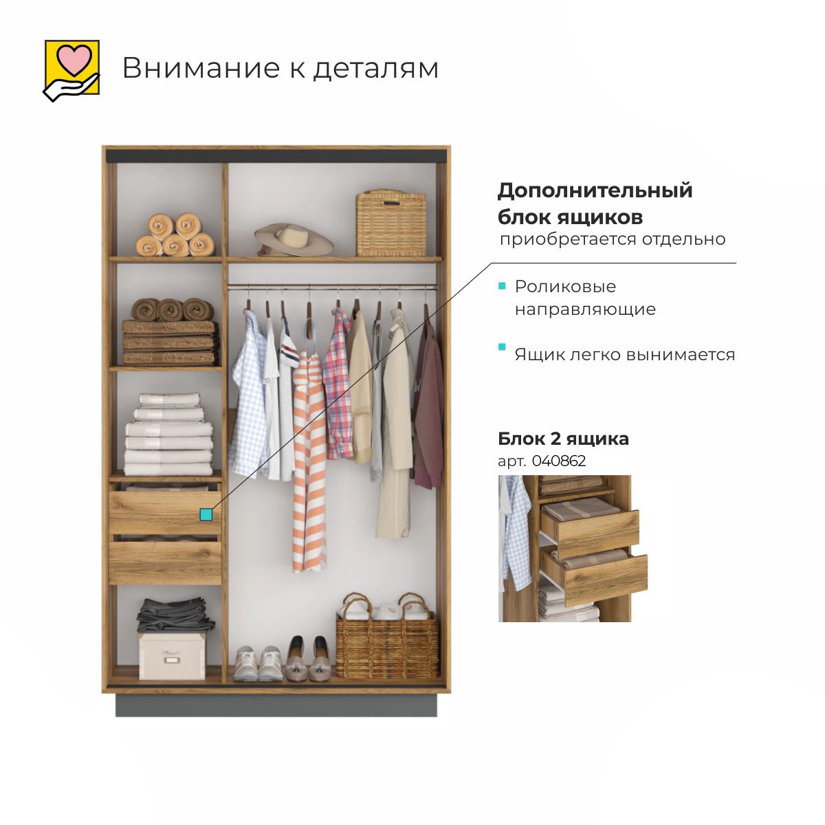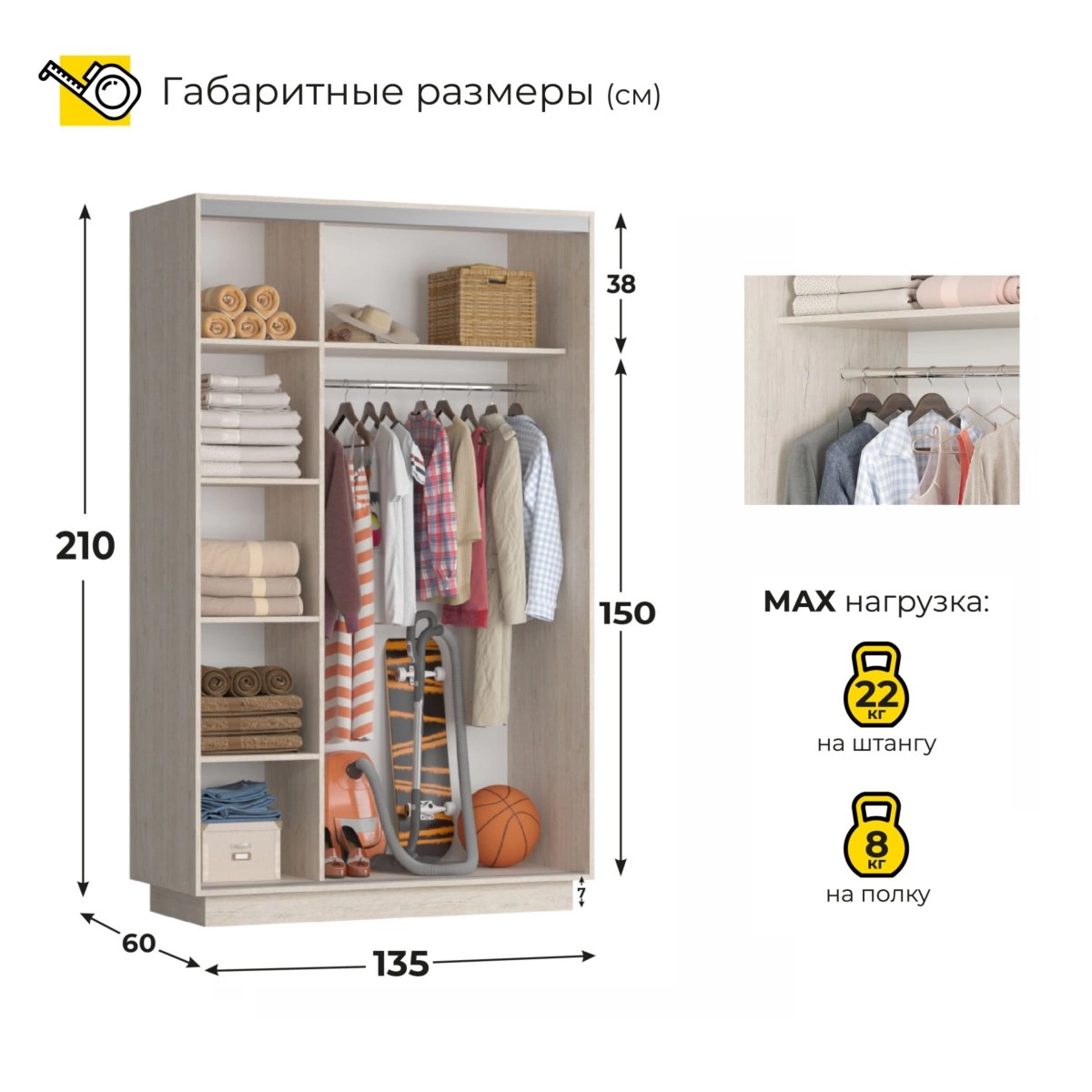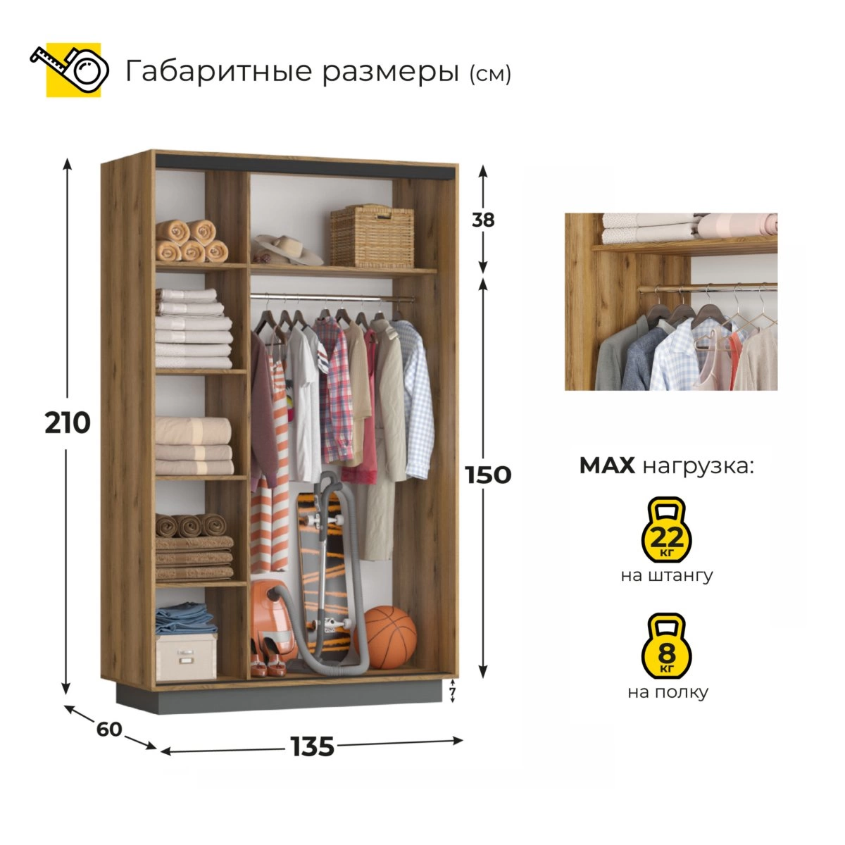 Основное преимущество данного шкафа – его вместительность. Несмотря на компактные размеры, он предоставляет множество вариантов для хранения вещей. Система раздвижных дверей экономит пространство, что особенно важно для небольших квартир.