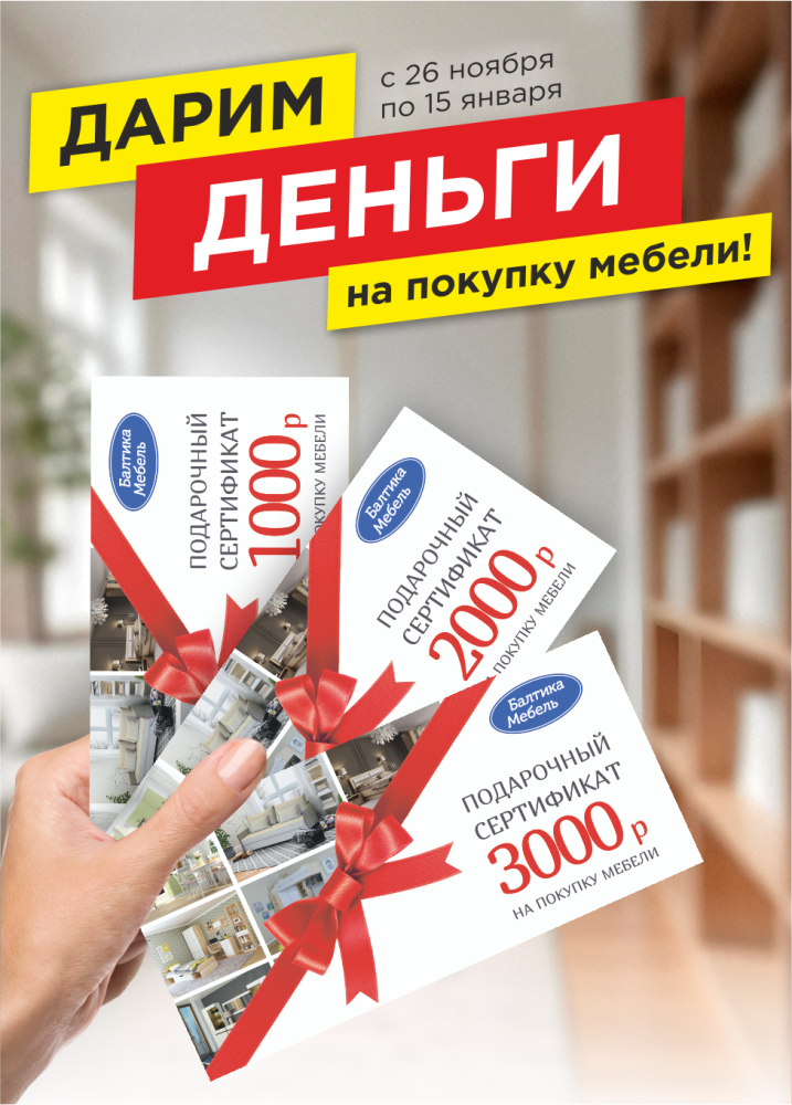 Приобретайте корпусную мебель производства «Балтика Мебель» вы получайте подарочные сертификаты на следующую покупку.