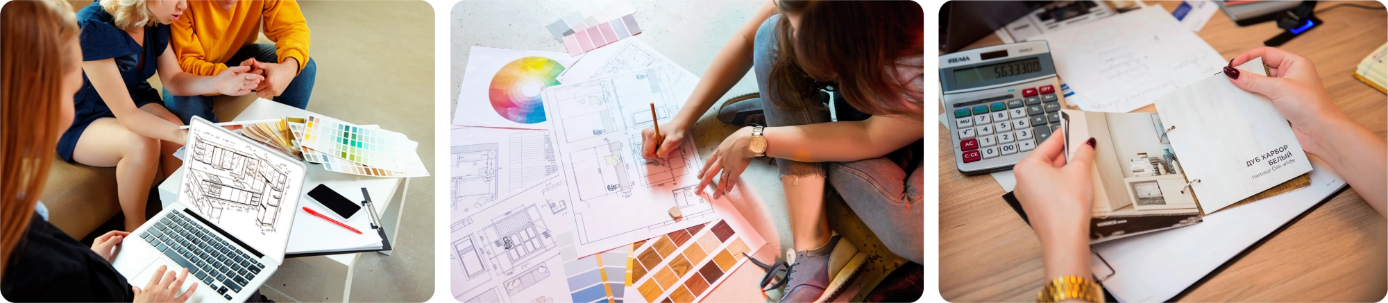 К вам приедет дизайнер и привезет с собой все необходимые образцы и каталоги, профессионально сделает замер и сразу же составит дизайн-проект.