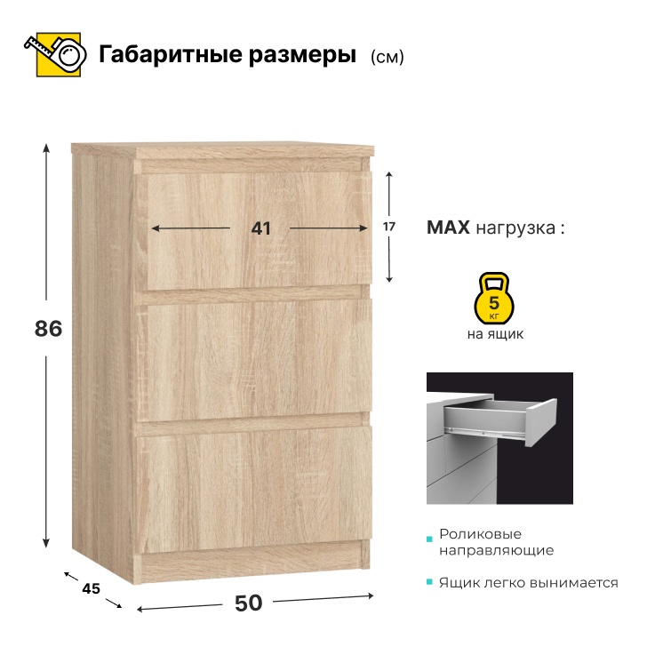▪ Три глубоких ящика на роликовых направляющих.