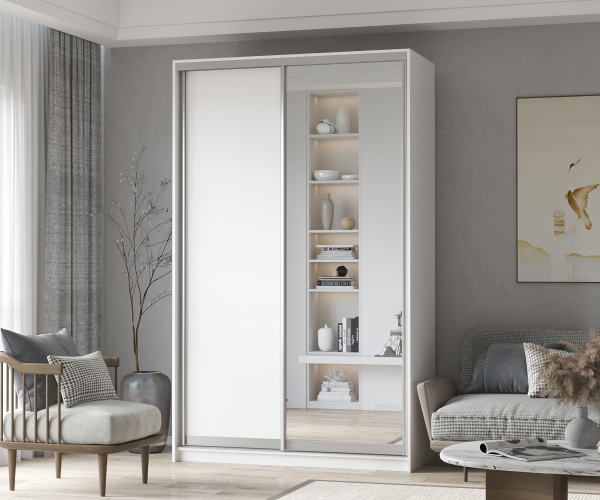 Конструкция изделия обеспечивает надежность и долговечность. Шкаф-купе легко открывается и закрывается, что делает его использование комфортным. Кроме того, слежение за чистотой и уход за мебелью не требует много усилий, что является важным преимуществом в современном ритме жизни.