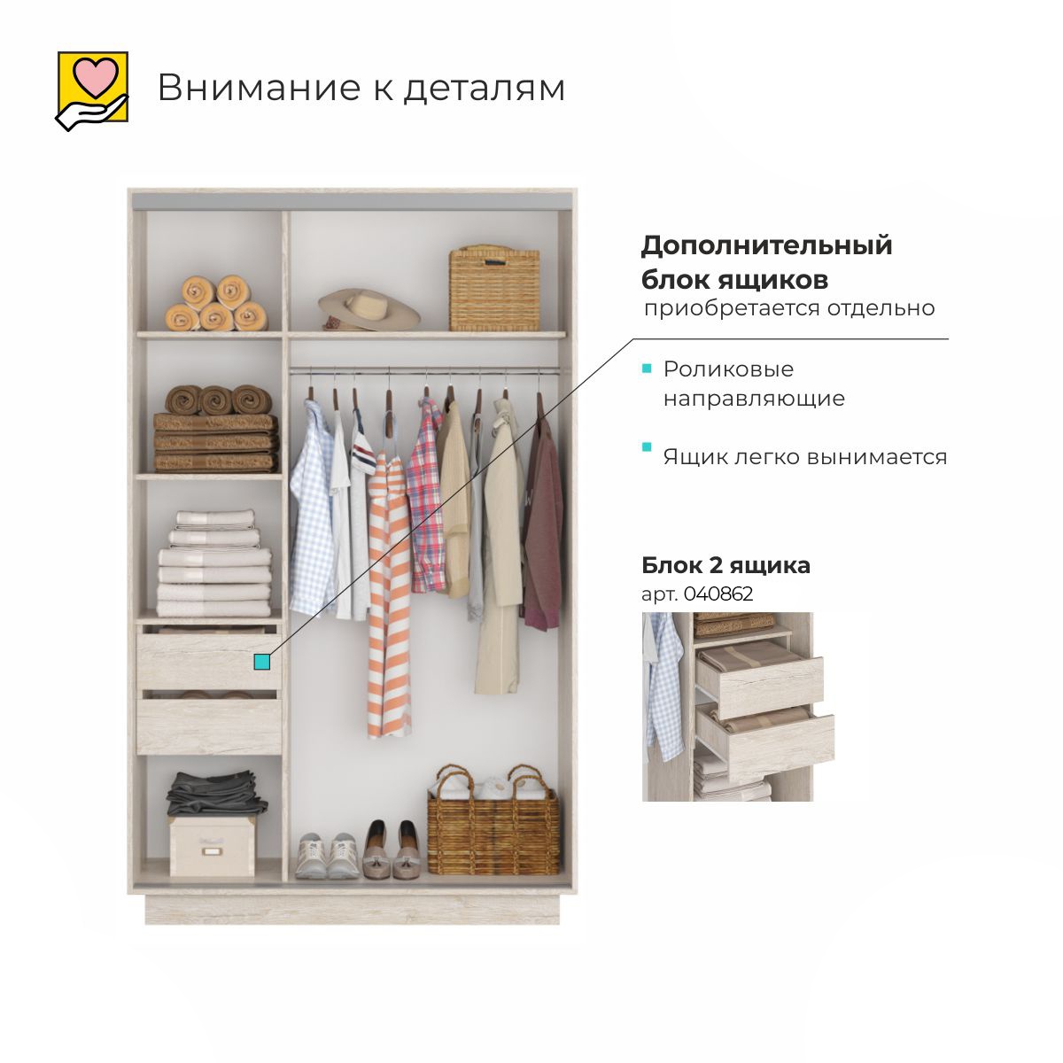 Основное преимущество данного шкафа – его вместительность. Несмотря на компактные размеры, он предоставляет множество вариантов для хранения вещей. Система раздвижных дверей экономит пространство, что особенно важно для небольших квартир.